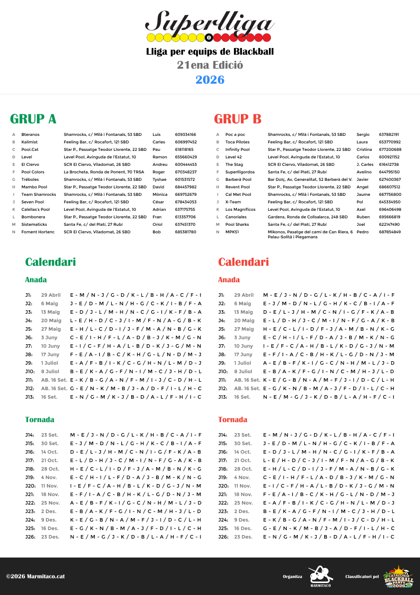 Tot i que intentem anar actualitzant els marcadors, sovint amb quatre taules és molt difícil d’aconseguir, us demanem als capitans un cop de mà per a poder seguir els resultats al moment en qualsevol taula.